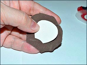 картон. Шов прикрываем лентой. Слегка смазав клеем картон, совмещаем кружок с цветком с