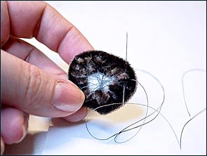 Пришиваем застежку ко второму бархатному кругу, прокалывая иглой оба слоя - бархат и